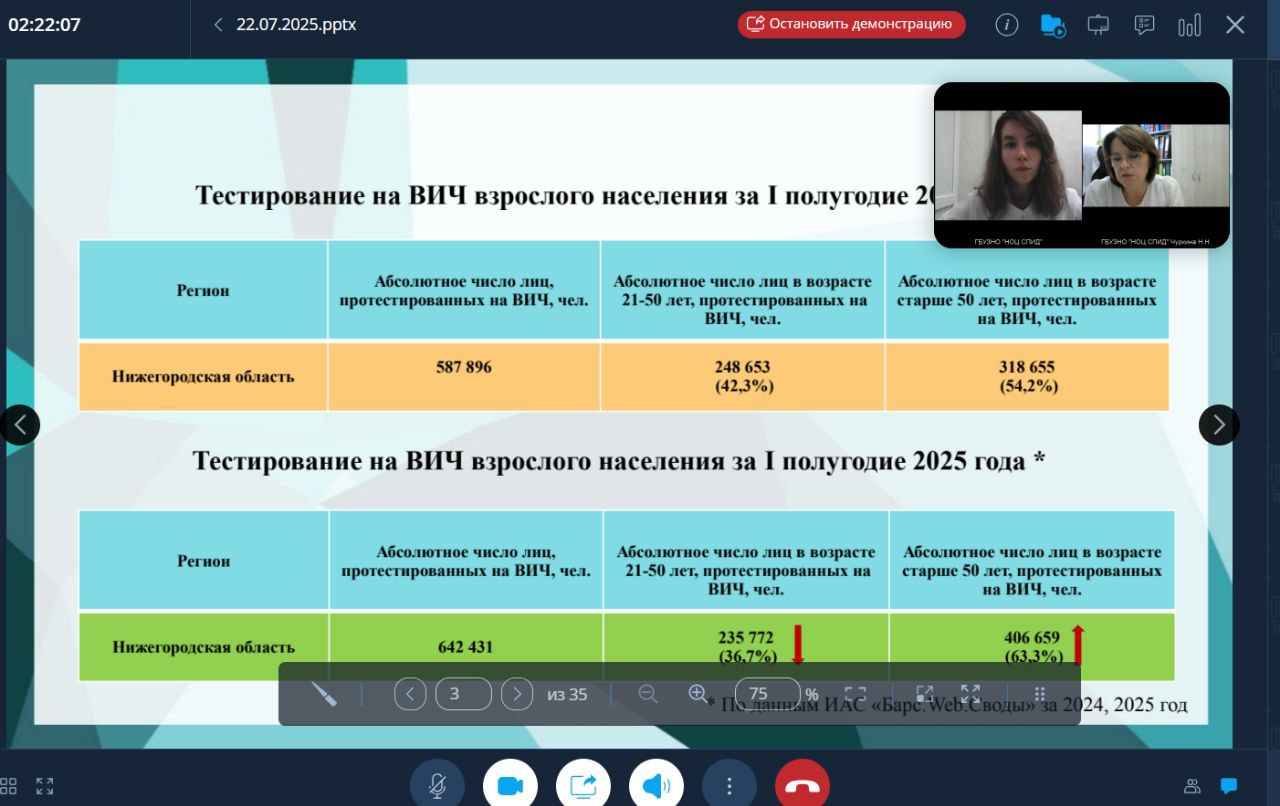 22 июля 2025 года на видеоселекторном совещании с подведомственными организациями Минздрава Нижегородской области заместитель главного врача по организационно-методической и профилактической работе Наталья Чуркина и врач-эпидемиолог Анастасия Моряшова обсудили итоги тестирования на ВИЧ-инфекцию населения Нижегородской области в первом полугодие 2025 года.